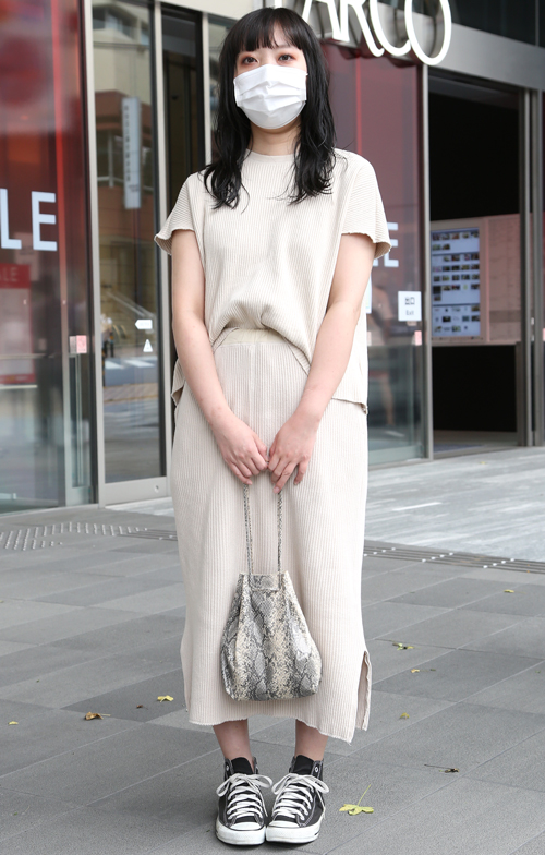 明度が高く彩色が低い色のトップスまたはボトムスを着用している女性すべて。柄や素材、デザインは問わない。