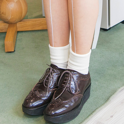 このソックスはちょっと光沢があって折りかえしがあるのがポイントです。ワンピースがメンズで、今日はメンズライクなコーデなので、足元はキレイめにしました。マニッシュな感じを出したくって白ソックスをプラスしました。タイツの縦ラインで脚長効果も狙っています。