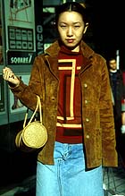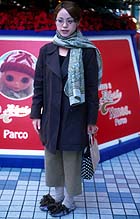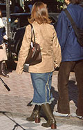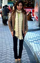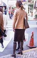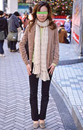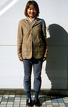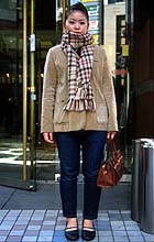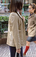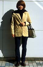女性ベージュ系ジャケット。ジャケット=前あきの上着(衿+身ごろ+袖)で、色がベージュ系のもの。素材やデザイン、丈等は問わない。