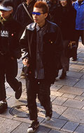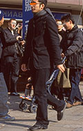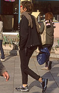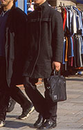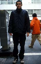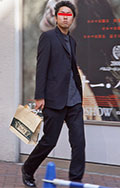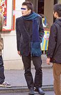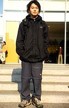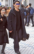 トップスもボトムスも黒いアイテムを着用している男性すべて。素材やデザインは問わない。