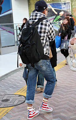 ハイカットを越えたロングスニーカーにパンツをイン。03年に人...