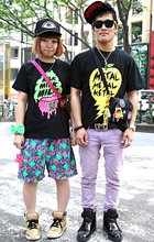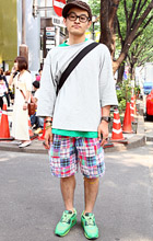 カラフルなスニーカーをハズしとして取り入れたスタイル。原宿で...