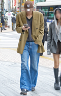 ベルベットのブルゾンにタイトなフレアジーンズと、フェミニンな...