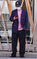 肩パッドの入ったダブルブレストのジャケットで敢えておじさんっ...