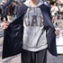 ジャケットでかたくなるイメージをキャップでゆるくはずし、バッグのオレンジを差し色にしてかたくなり過ぎないように。