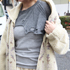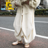 ボアアウターは寒さ対策としてあたたかいので選びました。オーバーだから全部ゆったりでまとめました。同系色で冬なので白を着たくなる気分です。薄底のスニーカーは女性らしさがあるから。淡いピンクもスタイルに合わせやすいです。長めのパンツをはいたときにトゥーだけ見えるのがよくて薄底スニーカーを履きます。