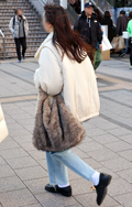 肘かけスタイルで存在感たっぷりのファーバッグ。持ち方によって...
