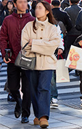 ショート丈アウターにフレアジーンズ、のカジュアルな着こなしだ...