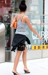 ベアワンピからブラの肩ひもを覗かせたスタイル。盛夏になり、ギ...