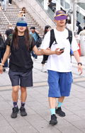 ■ズームアップアイテム定義バギー=だぶだぶしたの意味。ヒップから裾にかけて極端に太いシルエットで、膝とくるぶしの中間よりも短い丈のパンツを着用する男女すべて。