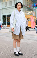 明度が高く彩色が低い色のトップスまたはボトムスを着用している女性すべて。柄や素材、デザインは問わない。