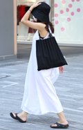 生成りのマチなしエコバッグをパンツと同系色のチャームでアレン...
