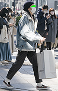 レオパード柄のエコバッグも散見された。ワイドパンツやスニーカ...