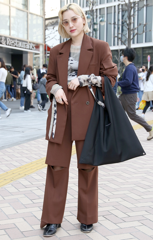 ベージュのダブルブレストジャケットも人気だった。先月白スニー...