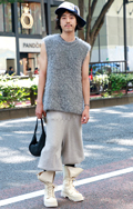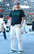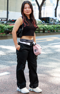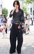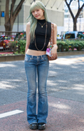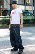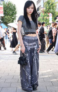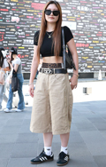 ■ズームアップアイテム定義股上が浅いデザインのボトムスすべて。ウエストの位置がへそ下5cm程度を目安とする。また、股上の深さが標準〜深いデザインのボトムスを意図的に下げてローライズ風に見せる着こなし(腰パン/下げパン)も含む。