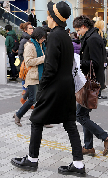 チェスターコートとハットの組み合わせが非常に多い。どちらも若...