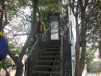 店舗設計は鈴野浩一さんと禿(かむろ)真哉さんによるユニット、トラフ建築設計事務所が担当した。老朽化したホテルをリノベーションしたCLASKA(クラスカ)の長期滞在客室「テンプレート・イン・クラスカ」(目黒区)や、ナイキ・プレスルーム(目黒区)などの作品で知られる新進気鋭の若手建築家だ。建物の構造はそのままにリノベーションし、1階をライフスタイルパック商品用のフロアに、2階のテクニカル商品用のフロアでは、大型リュックやバッグパッキングに適したシリーズなどを扱い、2フロア合計で約20坪。階段は外付けだが、エントランスにそびえる大樹と調和し、2階に行く時はツリーハウスによじ上るような気分が味わえる。