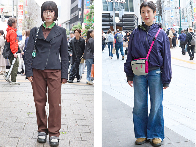 (右)ピンクのストラップのショルダーバッグはアークテリクスのもの。テック系のアイテムも黒ではなくて色物が増えてきた(https://www.web-across.com/observe/jsfem4000000619t.html)。