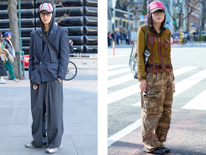 定点観測では1989/7に「男性野球帽」を取り上げて以来何度も記録しているテーマになりますが、00年代まではカジュアル要素が前面に出たアイテムでした。潮目が変わったのはやはり2012年の『POPEYE』リニューアル。上品でクラシカルなスタイルにキャップでハズし=遊び心を加えたシティボーイたちの、洗練されたリラックス感に近いムードが再浮上しています。もちろんフーディー×キャップ等のストリート感強めなコーディネートも健在で、幅広いスタイルで見られました。