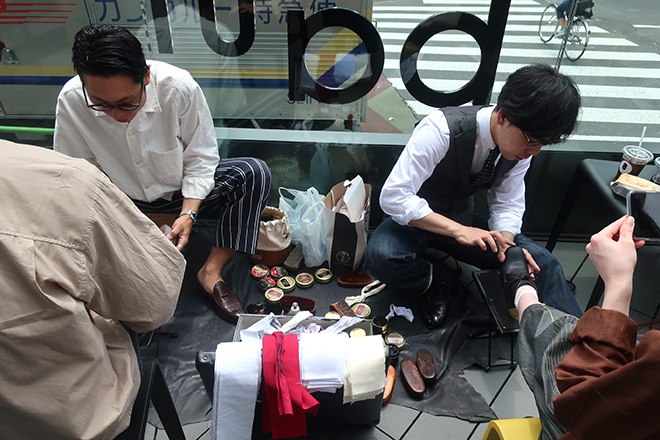 かつては路上にて靴磨きを行なっていた経験を持ちながら、現在では店舗を構え、後進の育成も行なっている長谷川さんと石見さん。そんな彼らがこの日、1日限定で路上(敷地内なので、正しくは「路上に近い状況」)にて靴磨きを行ったのには、路上をめぐってそれぞれの思いやこだわりがあった。